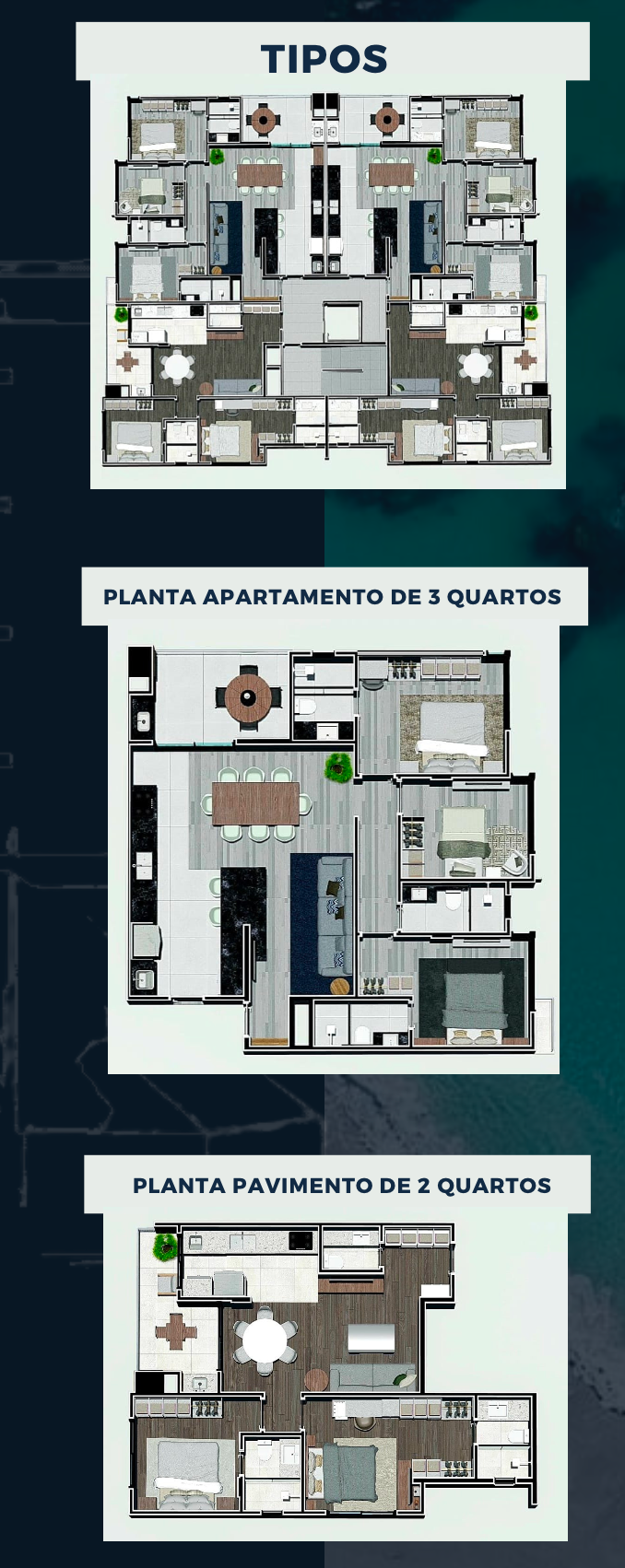 – Apartamentos tipo de 2 suítes e de 3 quartos sendo 2 suítes;